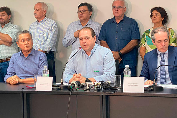 O presidente da Famasul (Federação da Agricultura e Pecuária do Mato Grosso do Sul), Marcelo Bertoni, que também preside a Comissão Nacional de Assuntos fundiários da CNA, informou o posicionamento da instituição a respeito do Marco Temporal durante coletiva à imprensa na tarde desta quinta-feira (28), em Campo Grande.